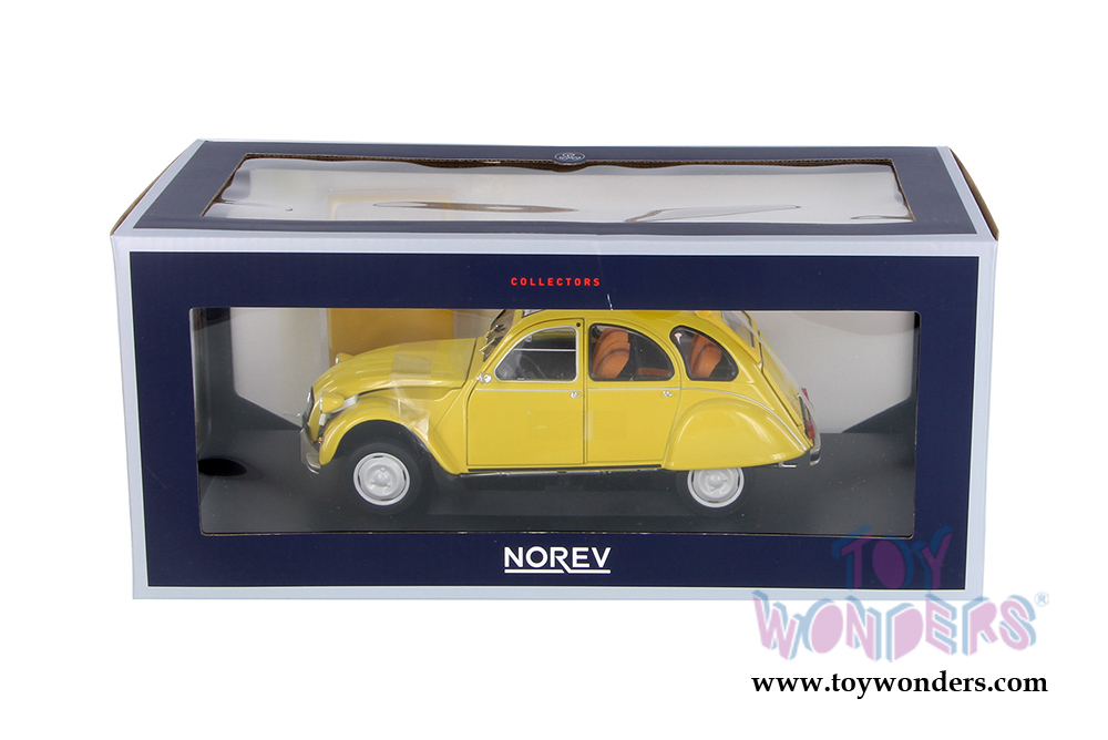 181496 Norev - 1979 Citroën 2CV 6 Club Hardtop. 1:18 scale diecast collectible model. This Citroen is an 8.25"L x 3.25"W x 3.25"H diecast metal car with openable hood, doors, and trunk. Detachable roof. Sits on a display plaque. This Citroen is manufactured by Norev. Individually packed in a window box. Box size: 13"L x 6.5"W x 5.75"H. 181496 is in Mimosa YELLOW color.