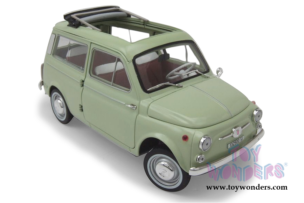 187723 Norev - 1962 Fiat 500 Giardiniera. 1:18 scale diecast collectible model. This Fiat 500 car is a 6.5"L x 3"W x 3"H diecast metal car. Openable doors, trunk, and hood. Sits on a display plaque. This Fiat 500 is manufactured by Norev. Individually packed. Individually packed in a window box. Box size: 13"L x 6.5"W x 5.75"H.187723 is in Light GREEN color.