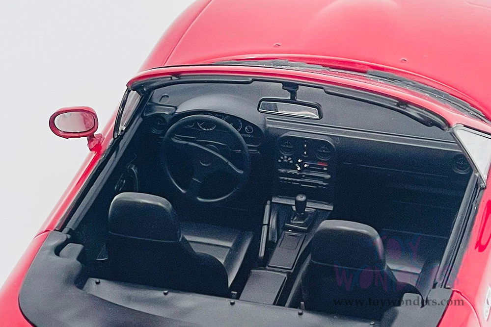 188020 Norev - 1989 Mazda MX-5 Miata Convertible. 1:18 scale diecast collectible model. This Mazda is approximately 8.5"L x 3.75"W x 3"H rubber tires, detailed interior and exterior. Has steerable wheels, removable top. Item 188020 is in Red. This 1989 Mazda is manufactured by Norev. Individually packed in a box. Box size: 12.75"L x 6.5"W x 5.75"H. Car is not openable.