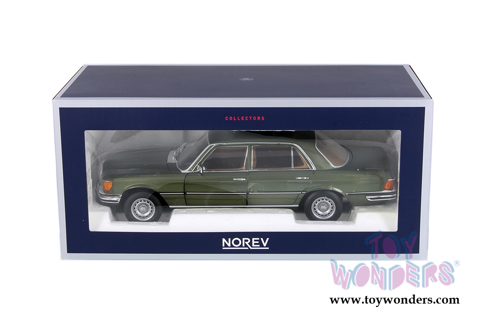 183455 Norev - 1976 Mercedes-Benz 450 SEL 6.9 Hardtop. 1:18 scale diecast collectible model. This Mercedes-Benz is a 10.5"L x 4"W x 3"H diecast metal car with openable hood, doors, and trunk. This Mercedes is manufactured by Norev. Individually packed in a box. Box size: 122.5"L x 6.5"W x 5.75"H. 183455 is in GREEN Metallic color.