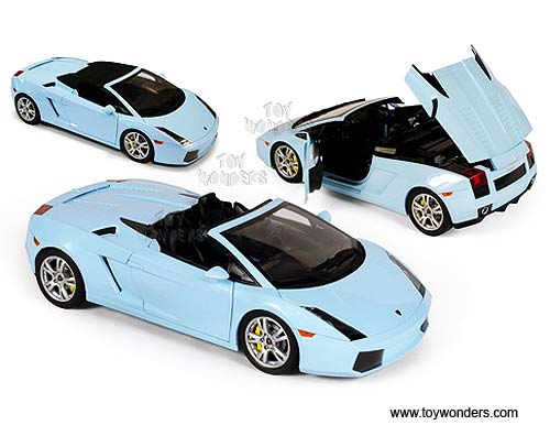 187951 Norev Show Room - 2006 Lamborghini Gallardo Spyder Convertible with Removable Bonnet. 1:18 scale diecast collectible model. This Lamborghini Gallardo Spyder is a 9.5"L x 3.75"W x 2.25"H die-cast metal car with openable bonnet, doors & trunk. Sits on a display plaque. Item 187951 is in LIGHT BLUE color. This 2006 Lamborghini Gallardo Spyder is manufactured by Norev. Individually packed in a window box. Box size: 12.75"L x 6.5"W x 5.75"H.