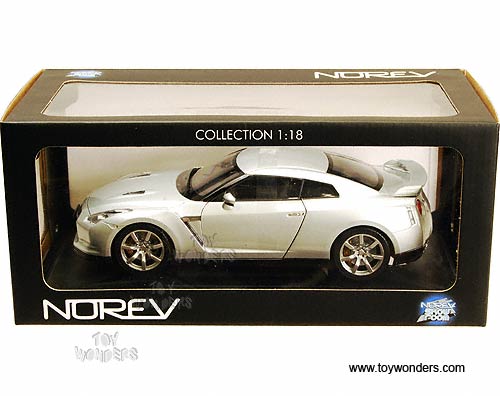 188050 Norev Show Room - 2008 Nissan GTR R-35 Hard Top. 1:18 scale diecast collectible model. This Nissan GT-R R35 is a 9.75"L x 4"W x 2.75"H die-cast metal car with openable hood, doors & trunk. Sits on a display plaque. 188050 is in ULTIMATE SILVER color. This Nissan GTR R-35 is manufactured by Norev. Individually packed in a window box. Box size: 12.75"L x 6.5"W x 5.75"H.