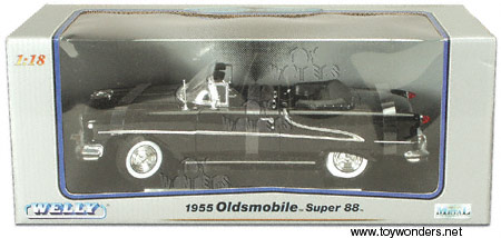 9869BK WELLY Oldsmobile Super 88 (1955). 1:18 scale diecast model. This 1955 Oldsmobile Super 88 is an 11"Lx4"Wx3"H diecast car with opening doors/hood/trunk, steerable front wheel, and detail component. Display stand. This 55 Oldsmobile Super 88 is manufactured by Welly. 4 pcs per inner box. BLACK only.