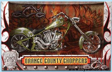 99212GN Orange Country Chopper. 1:6 scale diecast model. Bike is 13" long and 5.5" high. This diecast metal motorcycle comes with workable steering, free-wheel, and its highly detailed. OCC. 99212 in GREEN color.