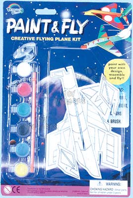 01A Paint & Fly - Airplanes. Styrofoam flying airplane easily assembled together. Glider airplane includes a six-color paint kit and brush to paint your own designs on the jets. Assorted styles. Blister card size: 12"x8". 12 pcs/inner.