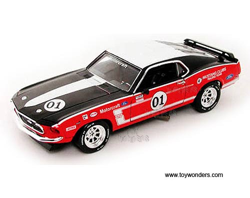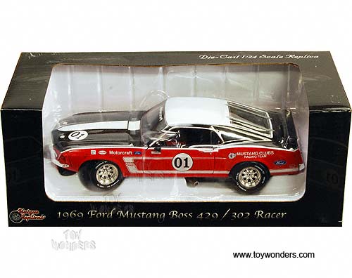 18655 Phoenix Unique Replicas - 1969 Ford Mustang Boss 302 Racer #01. 1:24 scale diecast collectible model car. This Ford Mustang Boss 302 measures 7.75"L x 3"W x 2"H die-cast metal race car with openable hood, doors & trunk. Manufactured by Phoenix. 6 pcs per inner box. 18655 is in RED, BLACK & White 3-tone colors. Individually packed in a window box. Box size: 10.25"L x 4.75"W x 4"H.