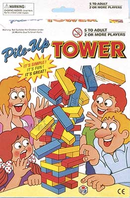 3306 Pile-Up Tower. Includes 45 blocks & 1 die. The object is to build the stack without knocking it down. Box size: 7.5"W x10"H x 1.25"D.