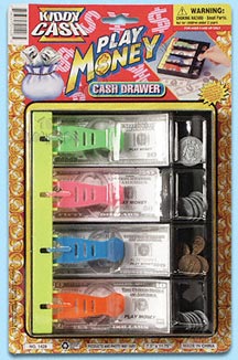 1428 Play Money Set w/ Cash Drawer. Money set include play dollars and coins in a PVC cash drawer. Drawer size: 7.5"Lx6"H. Blister card size: 7.5"Lx11.75"H.