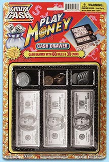 1728 Play Money Set w/Tray. Set include play dollars and coins in a plastic tray. Tray size: 6.5"Lx6.5"L. Blister card size: 7.5"Lx11.75"H.