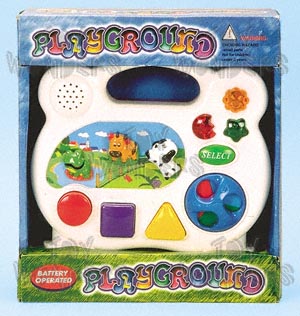 986/3 Playground. 7.5" playground that lets you select vocabulary learning, melodies and real sound effects. It has a turning melody wheel, moveable objects & flashing lights. Three assorted styles. Requires 3 "AA" batteries. Box size: 8.25"L x 2.5"W x 9"H.