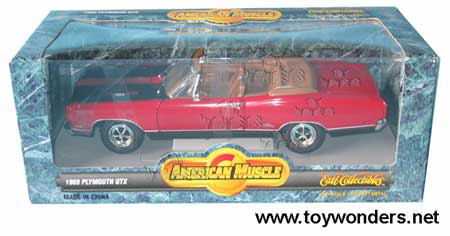 7248R ERTL-American Muscle Plymouth GTX Convertible (1969). 1:18 scale diecast model. This 1969 Plymouth GTX Convertible is a diecast metal with opening hood/doors and black stripes on hood. Brown color (Hey it's Corinthian Leather dude!) interior. This 69 Plymouth GTX is manufactured by American Muscle.