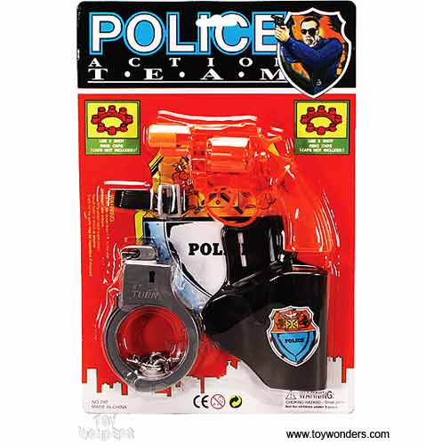 248 Police Action Team. This play set includes a 5" long pistol (gun), handcuffs, a belt and more. Card size: 8" x 12". 36 pcs/inner.