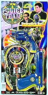 11965 Police Team. Set includes a 7.5" gun, a head phone, badge, darts, and a 4.5" revolver. Card size: 9.25"x18". 12 pcs/inner.