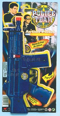 11961 Police Team Set. 12" police action pistol w/ rapid fire sound & sparkling visual effects. Sparks are contained w/in the window. Try Me packaging. Card size: 7"x14". 12 pcs/inner.