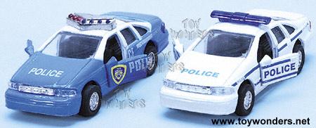 4.25"L die cast metal police & state trooper cars with pullback motor action and opening doors.