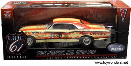 50024YL HIGHWAY 61 Pontiac GTO Drag Car (1966). 1:18 scale diecast model car. Arnie Beswick's '66 Pontiac GTO. This 1966 Pontiac GTO is a diecast metal collection car with removable body and flip front hood. This 66 Pontiac GTO is a manufactured by HWY 61; ref. no. 50024 in YELLOW color with orange stripes.Case pack: 6 pcsPrice quoted is for 1 pcs