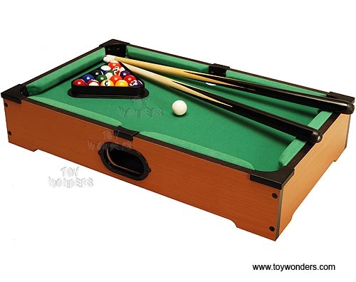 2010 Pool Table. This wood grain finished Tabletop Billiards game play set includes 16 balls, 2 wooden cue sticks, brush, and chalk. Fully Assembled. Table size: 20.5"L x 12.5"W x 4"H. Individually packed in a box. Box size: 21"L x 12.75"W x 4.5"H.
