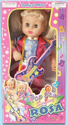 17103/2S Pop Star Singing Rosa. 16" battery operated doll. She sings and plays guitars/tambourine. Sonic control. Assorted styles in guitar and tambourine. Requires 3 "AA" batteries. Box size: 9"Lx5.25"Wx17.5"H. 6 pcs/inner.