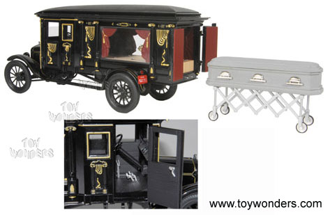 PMSC07BK Precision Miniatures - 1921 Ford Model T Ornate Carved Hearse. 1:18 scale diecast funeral car. 10.5" long die cast metal car with free wheels and opening doors. Includes vintage casket and church truck. Individually packed in a box. Box size: 12.25"Lx 7.5"Wx 6.25"H. Manufactured by Precision Miniatures. Sunset Coach. Ford Official Licensed Product. PMSC07B in BLACK color.