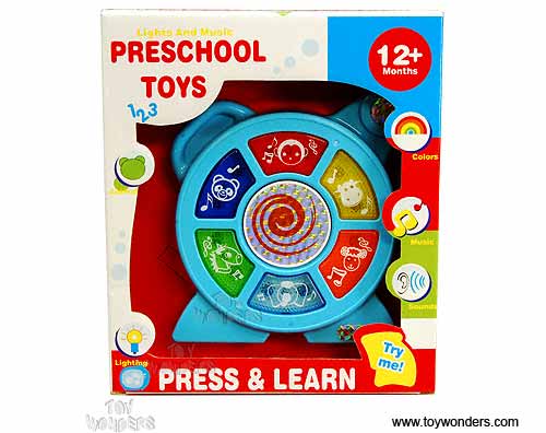 8035AB Preschool Musical Instruments w/ Lights & Music. This Musical Instrument features six buttons with flashing lights, different sounds and melodies. Includes 2 "AA" batteries. Box size: 9.25"L x 8"W x 2.5"H. 8035AB is in assorted styles. For 12 months and up. 18 pcs per inner.
