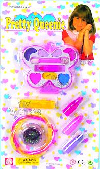 8832/4 Pretty Queenie. Cosmetic play set includes compact, powder & blush, 5" carrying case and bracelets filled with glitters. Assorted styles. Card size: 6.5"x11.5". 24 pcs/inner.