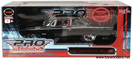31064BK MAISTO Chevy Bel Air (1962). 1:18 scale diecast model. This 1962 Chevrolet Belair is an 11" long diecast car with opening doors/hood/trunk. Donz wheels. This 62 Chevy Bel-Air is manufactured by Maisto Pro Rodz; ref. no. 31064 Chevy Belair in BLACK color.