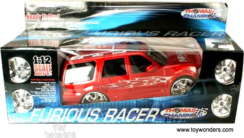 01341 R/C 7F Furious Racer Car. 1:12 scale. 17" long radio controlled full function SUV. Control distance is 80 meters. Headlight while forwarding. Taillight while backwarding. The lights under & inside the car will be on at the same time. Rearview mirror is movable. Full function: Forward, backward, turn left & right and stop. Includes 4 wheels, 2 turnbuckles, battery and charger. Box size: 26.75"L x 8.5"W x 11.75"H. Note: This item contains no diecast metal.