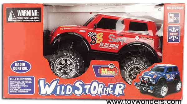 HQ5009 Wild Stormer. 17.5" radio controlled full-function, forward, reverse, left/right turn and stop. Frequency 27 MHz and 49 MHz. Includes rechargeable battery and AC adapter. Note: This item contains no any diecast metal.
