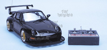 GP921 Porsche 911 GT2. 15" long radio controlled car. Full function with turbo power and the features include: super suspensions, recharging jack, air filled rubber tires, front wheel steering trimmer, detailed interior and telescopic antenna. Requires one "9V" & eight "AA" batteries. 18 kilometer/hour (11.18 mph). Frequency 27MHz. Assorted colors. Note: This item contains no any diecast metal.