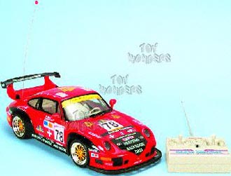 GP907 Porsche 911 GT2. 15" dual channel radio controlled Porsche 911 professional sports race car. Full function allows the sports car to be driven in all directions with turbo speed. Frequency 27MHz. Requires 1 "9V" & 8 "AA" batteries. Assorted colors. Box size: 20.75"L x 9.75"W x 8.5"H. 18 kilometer/hour (11.18 mph). Note: This item contains no any diecast metal.