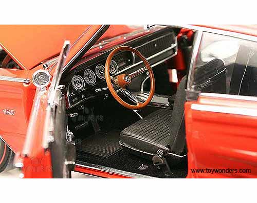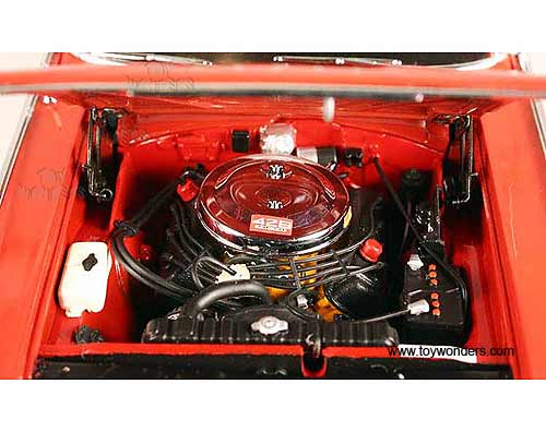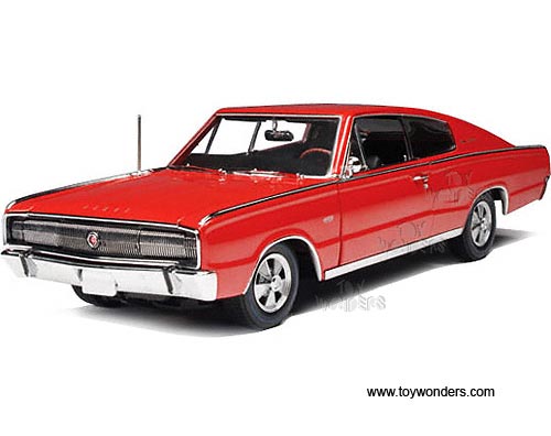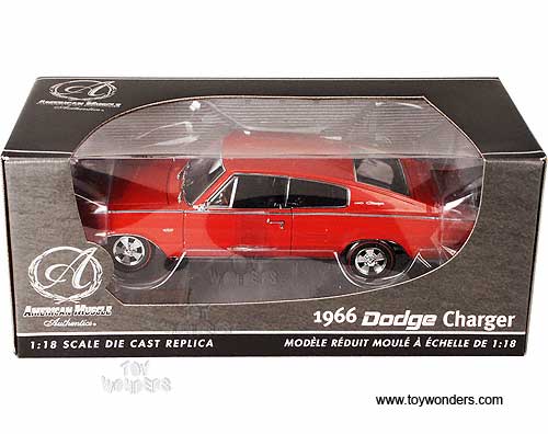 39319R ERTL - American Muscle Authentics - 1966 Dodge Charger Hard Top. 1:18 scale diecast model car. 11.5" long x 4"W x 2.75"H diecast collectible muscle car with opening doors/hood/trunk, realistic headlights & taillights, retractable radio antenna, highly polished electro-plated chrome parts. This 1966 Dodge Charger features steering wheel and front wheels turn together, sliding bench seal with folding seatback. Engine features detailed 383 CID engine with diecast oil pan and transmission, soft heater hoses, separate battery and cables, and full engine compartment labels and decals. Undercarriage features working front and rear suspension. Manufactured by RC2 Brands and is part of their Authentics line of cars; ref. no. 31319 in RED color. Individually packed in a window box.