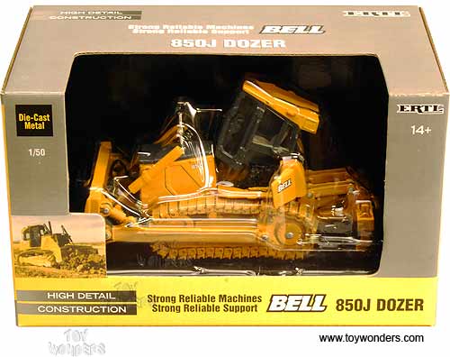 16188 RC2 ERTL Bell - 850J Dozer Farm Tractor. 1:50 scale diecast colletible model. This 850J Dozer farm tractor is 5.5"L x 2.5"W x 3"H. Individually packed in a window box. Box size: 7.5"L x 4.5"W x 4.5"H. This 850J Dozer farm tractor is manufactured by RC2 Brands. Item 16188 is in ORANGE color.