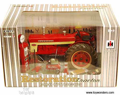14723 RC2 ERTL Case IH Restoration - Farmall 460 Farm Tractor w/ Accessories. This diecast collectible tractor is 1:16 scale about 8.5"L x 4.5"W x 5"H. Assessories include digital gas pump, floor jack, two jack stands, car creeper, hand-drill kit, and air compressor. Individually packed in a window box. Box size: 12.75"L x 8"W x 7.5"H. This farm tractor is manufactured by RC2 Brands. Item 14723 is in RED color.