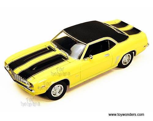 39454A ERTL - 1969 Chevy Camaro Z-28 Hard Top. 1:24 scale diecast collectible model car. This Chevrolet Z28 is a 7.75"Lx 3"Wx 2"H die cast metal car with openable hood. Turnable front wheels and free wheeling. This Chevy Camaro Z 28 is manufactured by RC2 Brands. Tray packed in clear plastic. 4 pcs per inner box. 39454 in YELLOW color with Black roof & Black stripes. GM is a trademark of the General Motors Corporation.