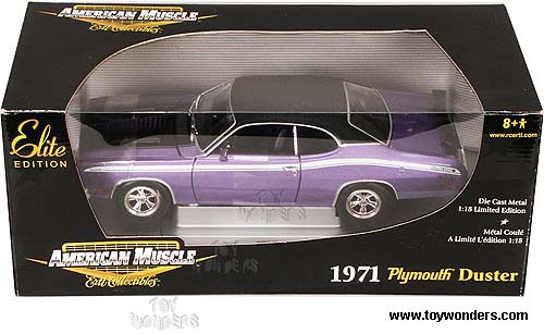 CC39326 ERTL Elite American Muscle Chase Car - 1971 Plymouth Duster Hard Top. 1:18 scale diecast collectible model car. This Plymouth Duster is a 10.5"Lx 3.75"W x 3"H die cast metal car with openable doors, hood & trunk, detailed interior & chassis, and steerable front wheels. Sits on a display platform. This 1971 Plymouth Duster is manufactured by RC2 Brands. Individually packed in a window box. Box size: 13.75"Lx 6.25"Wx 5.75"H. 39326 chase car is in PURPLE color with Black vinyl roof & Black interior (Regular production models are with a Purple colored hardtop roof & White interior).