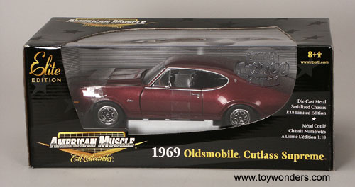 33979BG ERTL Elite American Muscle - 1969 Oldsmobile Cutlass Supreme Hard Top. 1:18 scale diecast Limited Elite Edition collection car. This Olds Cutlass Supreme features openable hood & doors. 350 engine. Stock rims and whitewall tires. RC2 Brands. Individually packed in a window box. 33979 in BURGUNDY color. GM is a trademark of the General Motors Corporation.