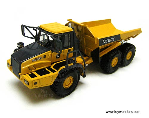 15252 RC2 ERTL John Deere - 400D Articulated Dump Truck. 1:50 scale diecast collectible model. This 400D Articulated farm tractor is a 7.75"L x 3"W x 3.25"H die-cast metal with openable hood & dumpable bed. Individually packed in a window box. Box size: 9.5"L x 4.75"W x 5"H. This 400D Articulated Dump Truck farm tractor is manufactured by RC2 Brands. Item 15252 is in ORANGE color.