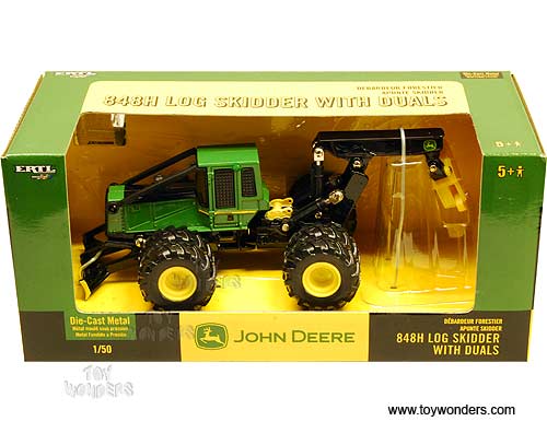 15888 RC2 ERTL John Deere - 848H Log Skidder w/ Duals Farm Tractor. 1:50 scale diecast collectible model. This 848H Log Skidder is a 7"L x 3.5"W x 2.75"H die-cast farm tractor. Individually packed in a window box. Box size: 9"L x 4"W x 4"H. This 848H Log Skidder farm tractor is manufactured by RC2 Brands. Item 15888 is in GREEN color.