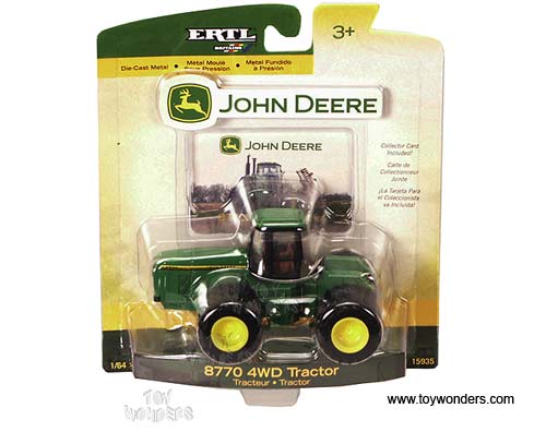 15935 RC2 ERTL John Deere - 8770 4WD Tractor. This diecast collectible tractor is 1:64 scale about 4" long. Individually blister carded. Card size: 6.25" x 7". This farm tractor is manufactured by RC2 Brands. Item 15935 is in GREEN color.