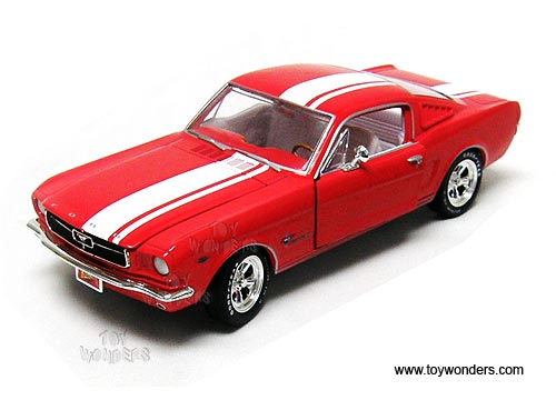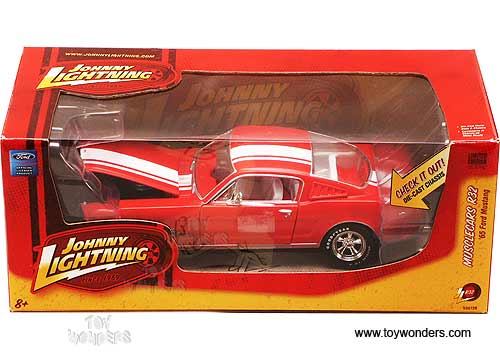 51105FR Johnny Lightning JL - 1965 Ford Mustang Hard Top. 1:24 scale diecast collectible model car. This Ford Mustang is a 7.25"L x 2.75"W x 2"H die cast metal car with openable hood & doors. Die-cast metal body & chassis. Limited edition collectible. This 65 Ford Mustang is is manufactured by RC2 Brands. Individually packed in a window box WB. Box size: 10"L x 4.5"W x 4"H. 51105F is in RED color with White stripes.