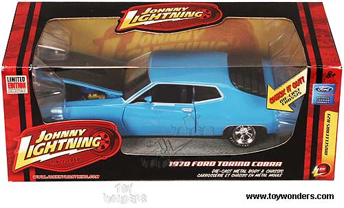 51105UBU Johnny Lightning JL - 1970 Ford Torino Cobra Hard Top. 1:24 scale diecast collectible model car. This Ford Torino Cobra is an 8"Lx 3.25"Wx 2"H die cast metal car with openable hood & doors. Die-cast metal body & chassis. Limited edition collectible. This Ford Torino Cobra is manufactured by RC2 Brands. Individually packed in a window box WB. Box size: 10"Lx 4.5"Wx 4"H. 51105U in BLUE color.