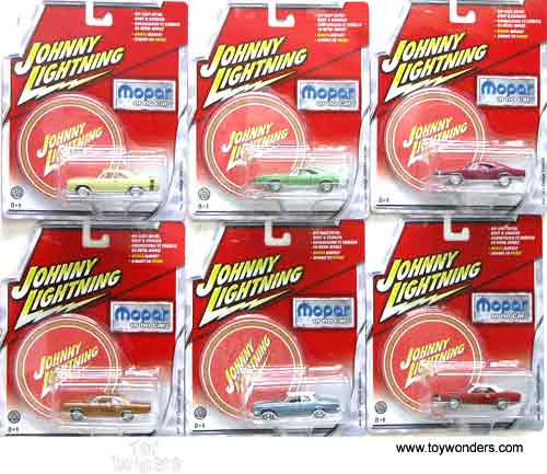 50157H JOHNNY LIGHTNING 1:64 scale diecast model car. Includes: 1962 Plymouth Belvedere, 1969 Dodge Dart GTS, 1970 Plymouth Barracuda (Cuda), 1969 Dodge Charger Daytona, 1970 Plymouth Sport Satelite, 1970 Dodge Charger. 50157 in assorted colors. Each car individually blister carded.