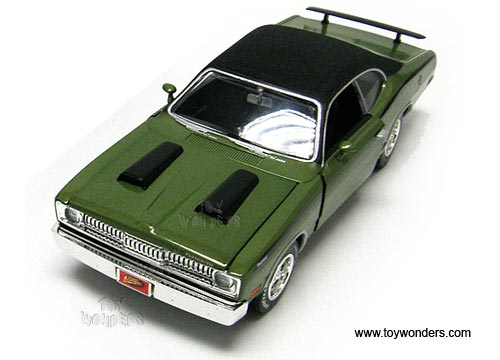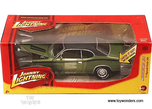 51105HGN Johnny Lightning JL - 1971 Plymouth Duster 340 Hard Top. 1:24 scale diecast collectible model car. This Plymouth Duster 340 is a 7.75"L x 2.75"W x 2.25"H die cast metal car with openable hood & doors. Die-cast metal body & chassis. Limited edition collectible. This 71 Plymouth Duster 340 is manufactured by RC2 Brands. Individually packed in a window box WB. Box size: 10"L x 4.5"W x 4"H. 51105H is in GREEN color with Black vinyl roof.