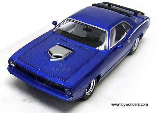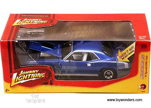 51105FBU Johnny Lightning JL - 1970 Plymouth HEMI Cuda Hard Top. 1:24 scale diecast collectible model car. This Plymouth HEMI Barracuda is a 7.5"L x 2.75"W x 2"H die cast metal car with openable hood & doors. Die-cast metal body & chassis. Limited edition collectible. This 70 Plymouth HEMI Cuda is manufactured by RC2 Brands. Individually packed in a window box WB. Box size: 10"L x 4.5"W x 4"H. 51105F is in BLUE color.
