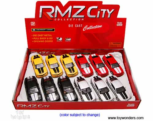 555005 RMZ City - 2010 Chevy Camaro Hard Top. 1:32 scale diecast collectible model car. This Chevrolet Camaro is a 5"L x 2"W x 1.25"H die cast metal car with pull back action and openable doors. This 2010 Chevy Camaro is manufactured by Uni-Fortune. 12 pcs per display box in assorted colors.  48 pcs per inner box. GM is a trademark of the General Motors Corporation.
