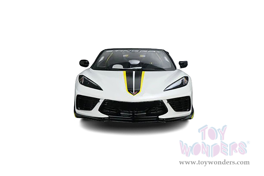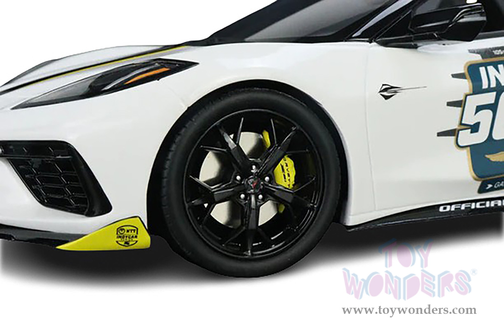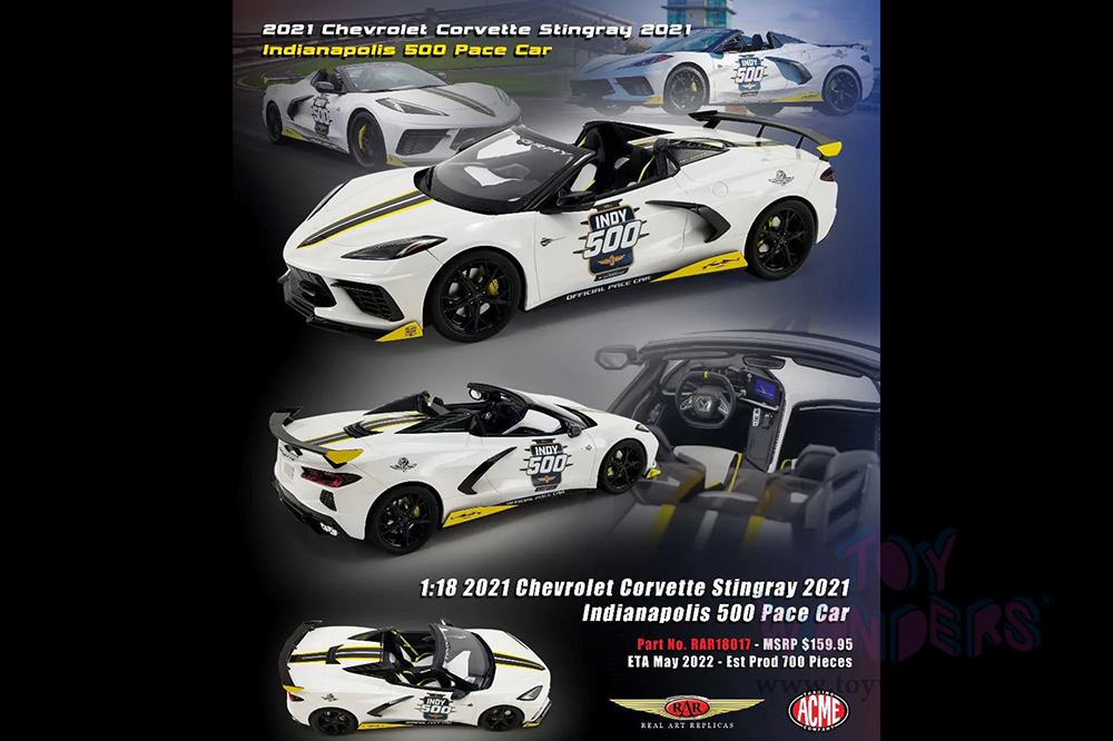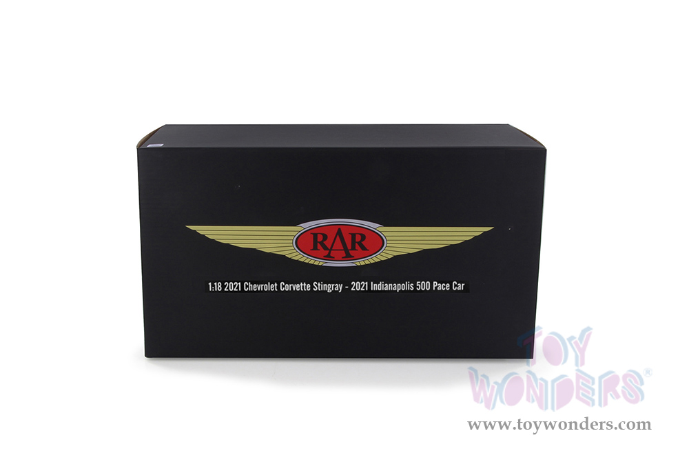 RAR18017 Real Art Replicas - 2021 Chevrolet® Corvette® Stingray Official Pace Car "105th Indianapolis 500". 1:18 scale resin collectible model. This Chevy® Corvette is a 10.5"L x 4.75"W x 2.5"H diecast with freewheeling, real rubber tires. Detailed interior, and exterior. This Indy Pace Car is manufactured by GT Spirit for Acme. Individually packed in a decorated box. Box size: 13.5"L x 7.25"W x 6.25"H. Limited Edition. Car is not openable.