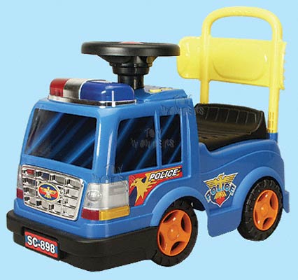 SC898 Drive-On My Police Car. 21.5" foot powered ride on police car. Features melodies, police warnings, honking horn, flashing lights & back seat compartment. Includes 3 "AA" batteries. Size: 22"Lx 11"Wx 13"H.