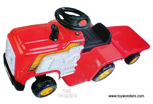 SC885R Ride-on Battery Operated Tractor with Cart. Tractor is 29.5"L x 18"W x 17"H, and Cart is 21"L x 14.5"W x 8.25"H. Age recommendation: 18 to 36 months (with adult supervision). Weight limit: 55 lbs. Car speed is 1 to 1.2 km/hr. This ride on Tractor features real sounding horn & motor sounds, left, right, forward & backward. Individually packed in a box. Box size: 31"L x 19.5"W x 17.5"H. SC885 is in RED color.