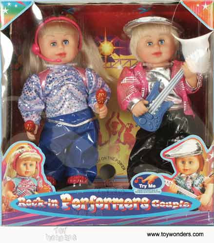 24202/2 Rock-In Performers Couple. 12" Dancing, singing doll couple, controllable dancing, rotating dance floor, flashing lights, sings classic children's songs. Requires 4 "AA" batteries (included). Box size: 13.5"L x 5.75"W x 14.5"H. 4 pcs/inner.