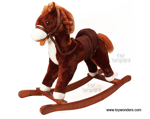 JR400A Rocking Pony. This rocking pony is 29"L x 12"W x 25"H with 16" seat height. It features real horse sounds (clippity clop & neigh) and moving mouth when pinch the ears of the horse. JR400A is in DARK BROWN color. Requires 3 "AA" batteries (not included). For ages 3 years and up. Each Rocking Horse is individually packed in a box. Box size is 23.5"L x 7.25"W x 21.125"H.